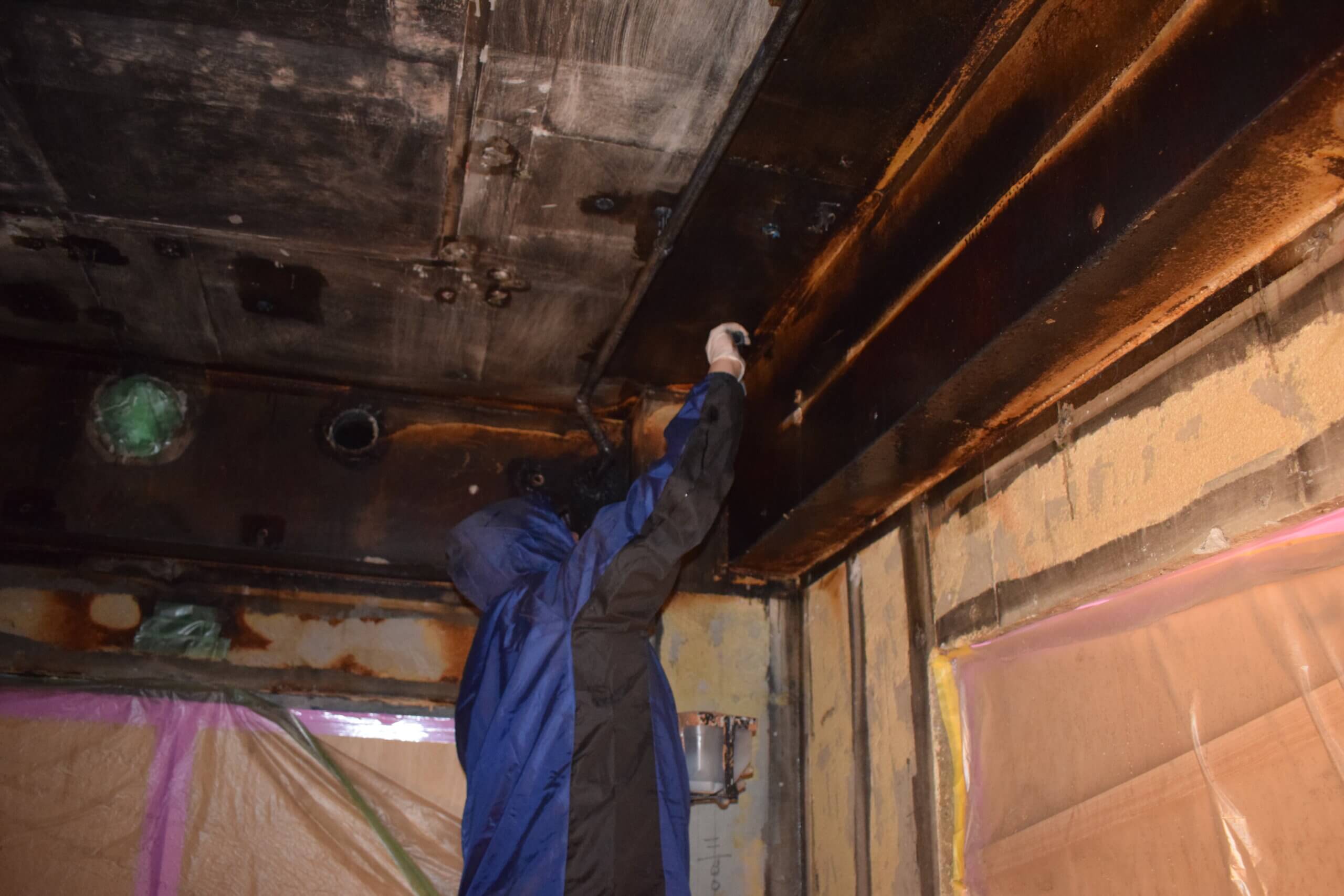 火災後の焦げた臭いの原因はを取り除くため、全面ケレン作業・煤清掃作業を施工致しました。