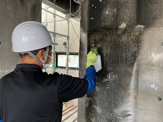 実際に現場を確認したところ、4階のお部屋にて電気火災が発生しており、9階のベランダや外壁まで所々真っ黒くなっていました。