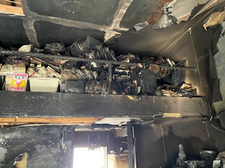 室内の火災被害状況は、天井部分の炎が強かった為か、酷く燃えたようでコンクリートが焦げてたり、煤もかなり付着している状態でした。