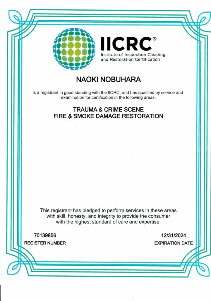 弊社には火災復旧最先端であるアメリカにて研修を受け、国際資格を取得しているスタッフも在籍しております。