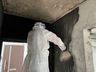 今回のご依頼は、建設会社様からのご依頼でした。現場に着きまして、建設会社のお客様と玄関ドアを開きましたら、ごみの処分、解体後の入室でしたが、温かい空気の中でものすごく焦げ臭い、苦いような煤臭気が漂っていました。建設会社様からは、この臭気を消してほしいとの作業依頼をお願いされました。現調後にお見積書を提出いたしまして、契約が完了いたしました。まずは。マンション火災の為、管理人の方に挨拶を致しまして、施工予定日を打ち合わせをさせて頂き、施工予定日、日数、近隣挨拶、マンションの掲示板に張り紙をさせて頂き、施工することになりました。