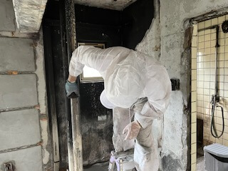 まずは、煤臭の原因になっている黒くなっている部分の焦げや、煤の汚れをケレン、煤清掃を致しまして、浮いている部分はすべて撤去しまして、煤も取れるところはできる限り清掃いたしました。ケレンと煤清掃をしっかりと施工した後に、下地の不良を防ぐ為に、壁塗り材を全体に施工することにより、剥がれ防止、煤飛散防止と臭気を減少させることができます。