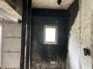 火災復旧作業前の状況です。全室天井、梁など上部は全体的に火事による煤が隙間から入った為、真黒く煤が付着して汚れていました。