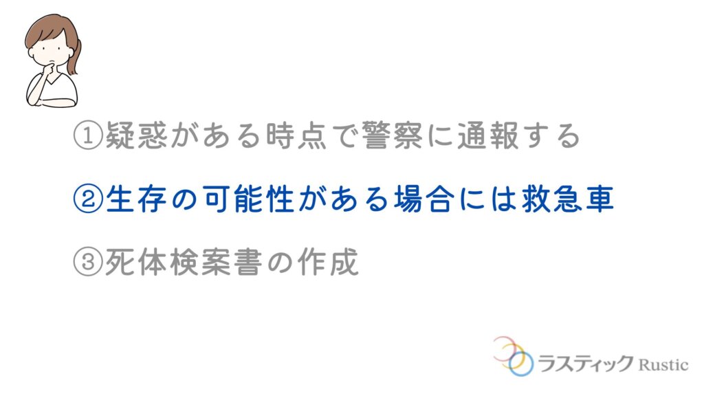 その後、現場に到着した救急隊員が生存の有無を確します。