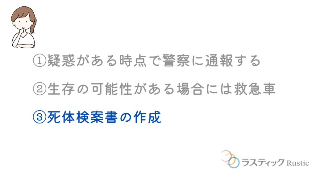 死亡が確認された場合には、警察に連絡して現場状況の確認に入ります。