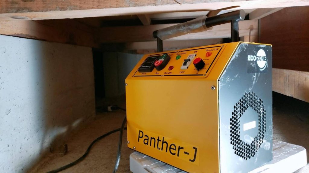 床下の細菌や臭気は綺麗に消毒清掃をして消毒後、さらに消毒剤をフォグマスターを使用しまして噴霧し、そこで少し時間を空けた後に、消臭機を使用してオゾン発生器による大量のオゾンガスと大風量によって、強力なエネルギーの酸化分解破壊により、消毒、消臭する事で、床下状態は衛生的な空間にすることができます。