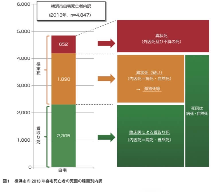 垣内氏、内藤氏の「神奈川県内における在宅死亡割合と医療社会的の地域相関分布」によれば、横浜市の2013年自宅死亡者の死因の種類別内訳において、異常死(疑い)、異常死を合わせると、約2,500件とされています。
